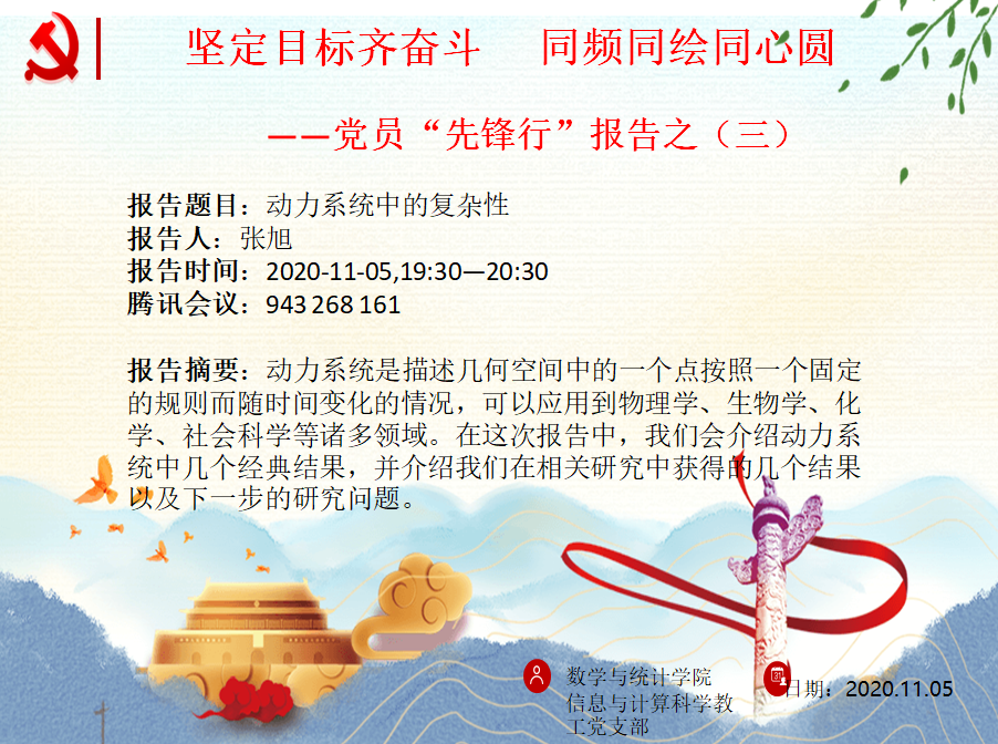 本站讯 2020年11月5日晚,bat365在线中国官网登录入口信息与计算科学系教工党支部于腾讯会议举办“坚定目标齐奋斗 同频同绘同心圆——党员‘先锋行’报告第三期”,本次活动由信息与计算科学系教工党支部书记亓兴勤主持,信息与计算科学系主任张旭副教授担任主讲人,学院党委副书记王鹏飞、信息与计算科学教工党支部成员和部分学生参加。