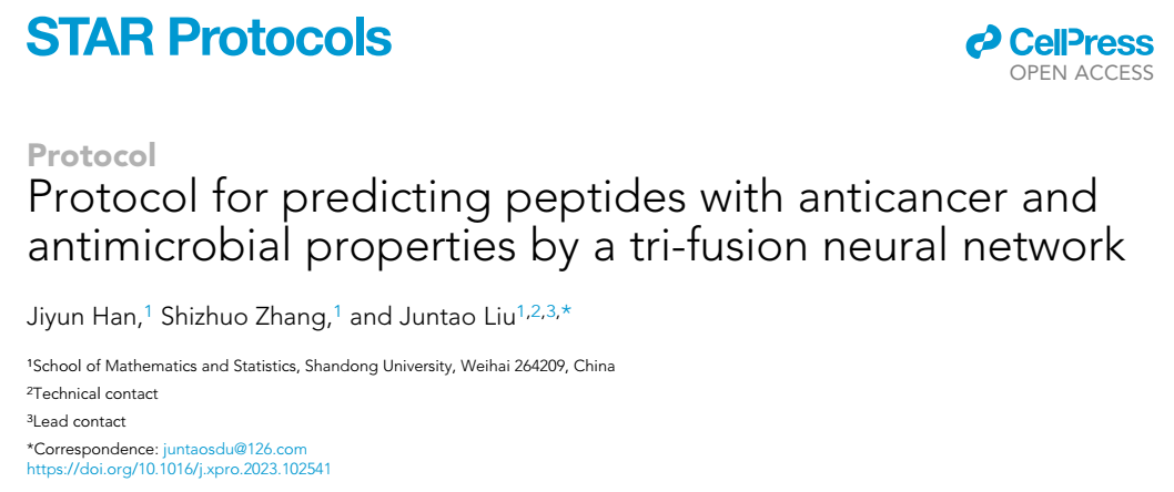 本站讯 近日,bat365在线中国官网登录入口柳军涛课题组在生物学国际顶级期刊Cell的子刊Star Protocols发表了题为“Protocol for predicting peptides with anticancer and antimicrobial properties by a tri-fusion neural network”的论文,该文章展示了如何使用他们之前开发的工具TriNet预测抗癌肽和抗菌肽的运行流程。bat365在线中国官网登录入口为第一完成单位,bat365在线中国官网登录入口韩济蕴为论文第一作者,柳军涛为通讯作者。