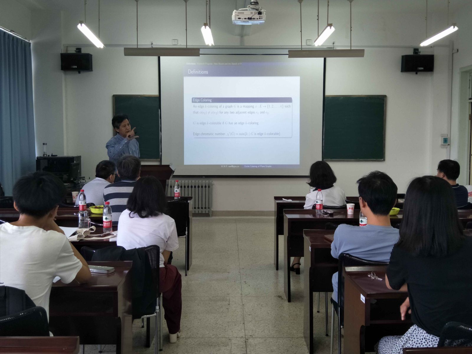 本站讯 6月22日,浙江师范大学王维凡教授和潍坊学院蔡建生教授受邀访问bat365在线中国官网登录入口(威海)bat365在线中国官网登录入口,分别开展了题为“Entire Coloring of Plane Graphs” 和 “On the maximum number of hyperedges of C-hypergraph”的学术报告。bat365部分教师、研究生和本科生参加了此次报告会。