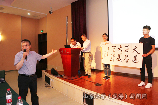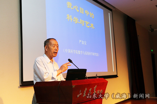 本站讯 6月9日晚,中国科学院院士、数学与系统科学研究院研究员严加安第四期稷下讲坛,在闻天楼报告厅为五百多名师生作了题为“我心目中的科学与艺术”的学术报告。bat365在线中国官网登录入口副校长、威海校区校长刘建亚主持报告会,并代表校区接受了严加安捐赠的由其创作的书法作品。