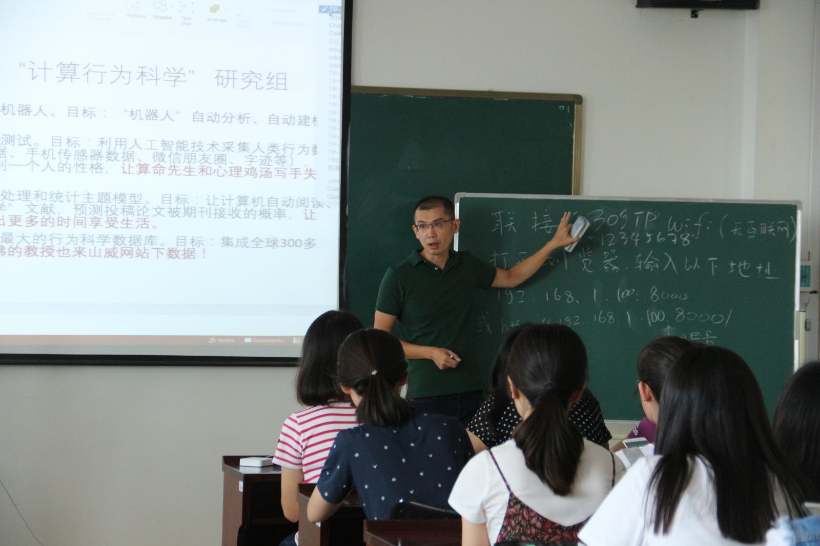 首先,郭亮教授为大家简单介绍了山威“计算行为科学”研究组。该研究组是继麻省理工学院(MIT)研究组和乔治亚理工学院研究组之后的第三大研究组,研究内容与机器学习、统计、社会科学紧密结合,其主要研究方向为自动统计机器人、快速性格测试、自然语言处理和统计主题模型、建立全球最大的行为科学数据库等。该研究组主要招收bat365在线中国官网登录入口(威海)bat365在线中国官网登录入口优秀的研究生、硕士生等相关人才。随后,为了增进学生们对研究组研究内容的理解,郭亮教授带领大家完成了一项线上小测试,并通过样本数据的检验,向大家解释人们喜爱的宠物与其性格的关系。紧接着,他又为大家解释了星座与性格的关系,使同学们简单了解到研究组在心理学方面的研究。最后,郭亮教授为大家带来了一些有趣的知识分享,让大家对“计算行为科学”研究组有了更多的了解。本次宣讲会在一片热烈的掌声中落下帷幕。
