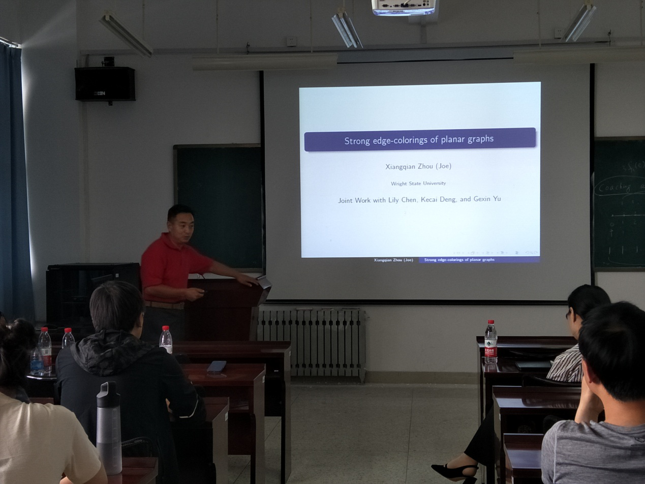 本站讯 2018年6月15日,美国莱特州立大学(Wright State University, USA)数学与统计系副教授周向前应邀访问bat365,开展了题为“平面图的强边染色”的学术报告,学院部分师生参加了此次报告。