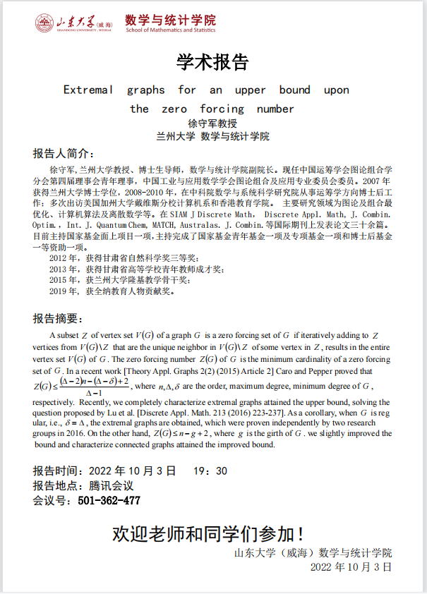 学术报告:Extremal Graphs for an Upper Bound Upon the Zero Forcing Number