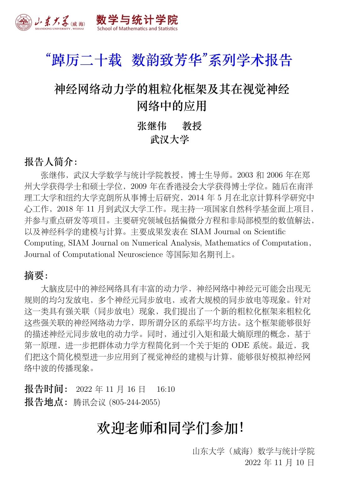 学术报告:神经网络动力学的粗粒化框架及其在视觉神经网络中的应用