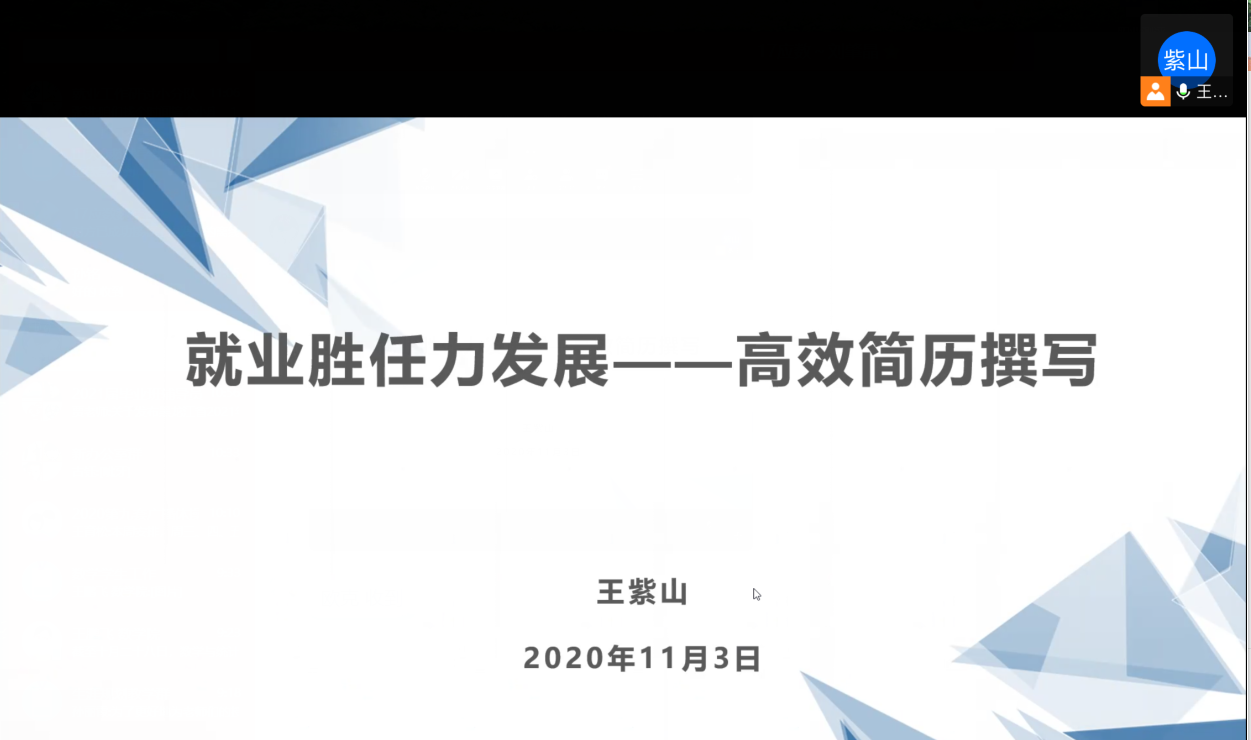 本站讯 为解决同学们在简历制作过程中存在的疑惑和问题,帮助毕业生做好就业准备,提升学生就业素养。11月3日上午,bat365于腾讯会议举办线上“就业胜任力发展——高效简历撰写”简历制作培训会。毕业班辅导员王紫山主持并主讲,2017级部分同学参加会议。