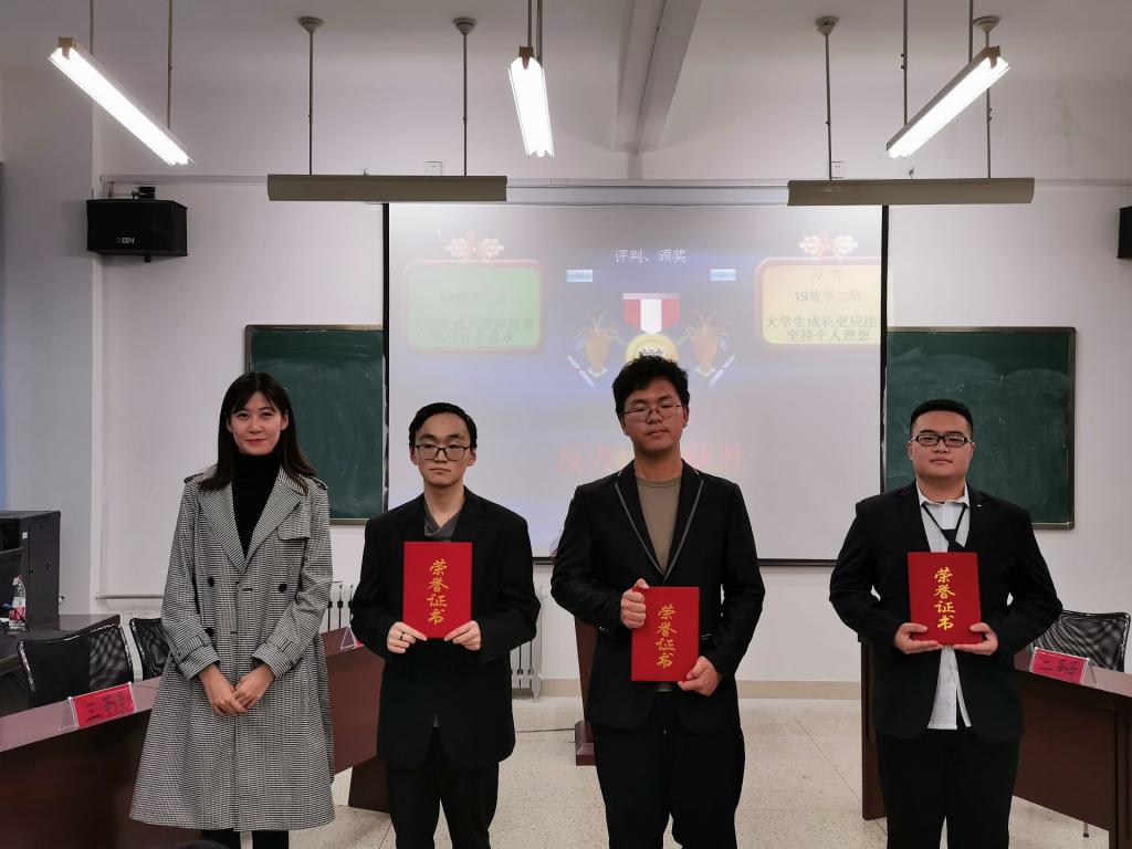 决赛共分为两场,第一场为三四名决赛,正方2019级数学三班数科联队对阵反方2018级数学数科联队。双方以“科学是否是世界的最优解”为辩题紧扣论点,层层深入,依次表达自己的观点。最后,反方2018级数学数科联队获得辩论赛的第三名,本场比赛最佳辩手为反方四辩叶家辉。第二场为冠亚军决赛,正方2019级数学一班对阵反方2019级数学二班。双方以“大学生成长更应注重顺应社会需求还是坚持个人理想”为辩题,从生存、理想与现实三个角度进行了思维的深度碰撞,最终反方2019级数学二班赢得了辩论赛的冠军,反方二辩罗正阳被评为最佳辩手。