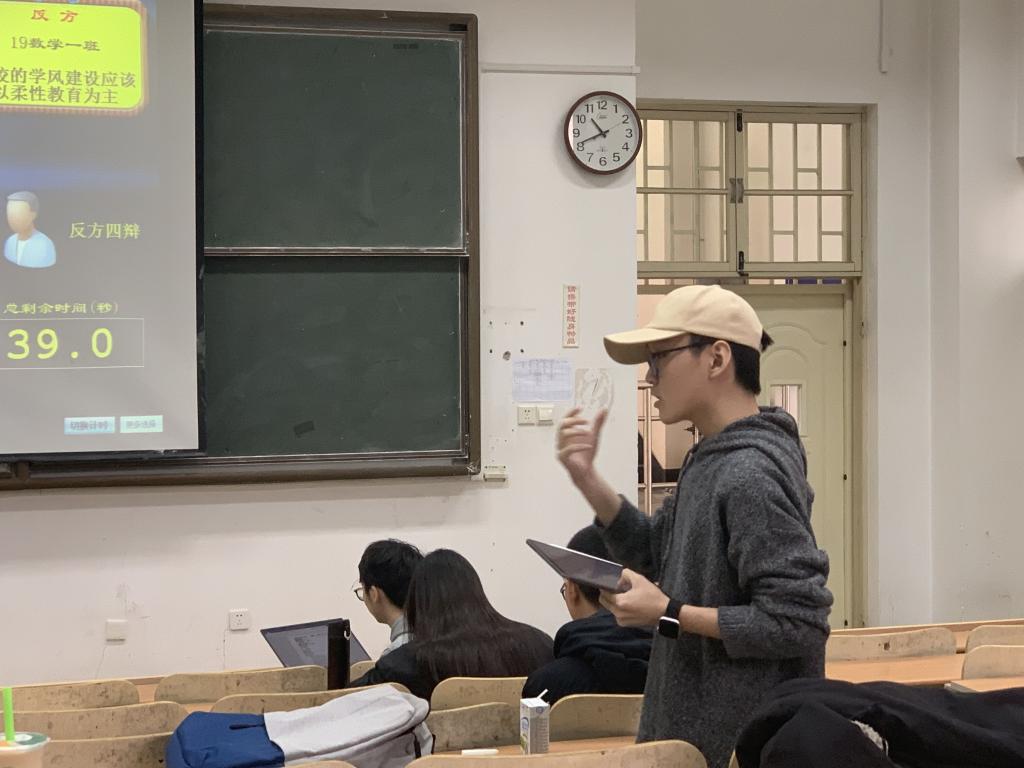 辩论赛伊始,主持人向全体辩手和观众介绍了比赛流程。第一场比赛中,双方围绕“灾难中自私是否应该受到谴责”的辩题展开了激烈的辩论,面对正方选手的率先发难,反方辩手临危不乱,从立论到自由辩论再到结辩纲举目张,一气呵成。最终,反方2019级数学类一班赢得了本场比赛,反方四辩宋佩博被评为最佳辩手。第二场比赛中,两方以“高校的学风建设是否应以刚性为主”为辩题,从学风含义、教育制度、教学理念等方面进行了思维的深度碰撞,为观众带来了一场势均力敌的精彩较量。在经过激烈的辩论后,最终反方2018级数学数科联队获得了本场比赛的胜利,反方四辩叶家辉被评为最佳辩手。