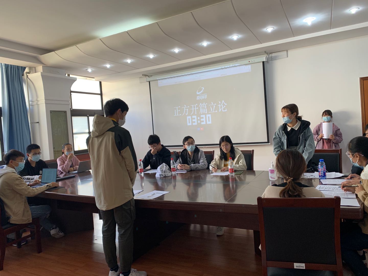 本站讯 10月17日上午,bat365于图东环楼216研讨室举办了第一期“数韵风采,谁语争锋”新生辩论赛。本次辩论赛共分两场,第一场由正方2020级数学类二班对阵反方2020级数学类四班,第二场由正方2020级数学类三班对阵反方2020级数学类一班。本次辩论赛由石俊煊担任主席,唐浩博负责计时,其中第一场评委为叶家辉、陈晓姝、薛建恒,第二场评委为丁夏菲、薛建恒、张正泽。