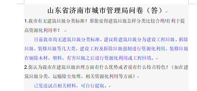 8月20日上午9时,队员苑浩月代表团队到达德州市城市管理局,在对团队进行了简短的介绍之后,访谈正式开始,王科长首先询问了调研团目前研究的成果,并结合德州市实际情况提出了部分建议。当调研团提及目前正在研究推行建筑垃圾资源化利用管理过程中遇到的难题时,王科长对调研团说,就德州市而言,政府在推进建筑垃圾资源化利用的过程中存在着政策落实不到位、和企业合作存在问题以及缺乏系统的管理模式等问题。目前政府也正在积极探索寻找更为合理的管理模式,学习先进地区的经验,完善自我。访谈最后,调研团询问了王科长对于建筑垃圾资源化利用的看法,王科长讲到,如今德州市正致力于构建山东省文明城市,妥善处理建筑垃圾,好好保护环境也是构建文明城市中不可或缺的重要部分,德州市和相关政府和企业也应加强合作,探寻更好的建筑垃圾解决之道。此外,山东省循环经济协会、山东省济南市城市管理局的访谈问卷也于今日回收,队员王雪飞也对临沂蓝泰有限公司进行了电话访谈,各单位负责人都给予了团队极大的帮助和支持,调研团也在与负责人一对一的交流中对济南市以及临沂市建筑垃圾处理的现状有了进一步的认识,了解到了济南市和临沂市在建筑垃圾处理的过程中存在的问题以及自己独特的经验,访谈结束后,调研团召开总结会,将所有访谈资料进行归纳整理,并对接下来的任务做出调整。