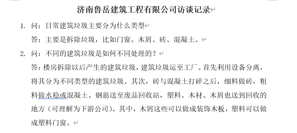 首先,团队在提前与四家企业相关负责人约好时间的基础上,根据不同企业的不同主营业务,侧重采访不同的有关建筑垃圾治理的问题。因此在采访过程中,对于山东高投市政工程有限公司的节能环保工程施工的相关问题为主,潍坊三建集团则偏重于建材销售环节,济南鲁岳建筑工程有限公司围绕废弃资源综合利用的问题,济南曦阳建设工程有限公司则侧重于建筑垃圾回收处理及再利用。对于团队提出的问题,四家企业负责人给予详细的答复,同时将与团队研究问题相关的企业补充材料发送至邮箱以供团队借鉴参考,团队获取大量有用信息。同时,企业负责人针对团队研究的课题给予方向上的指导意见,团队对课题研究方向进一步细致化。访谈结束后,团队队员对四位企业负责人表示了衷心的感谢并对电话访谈的录音做了及时整理。