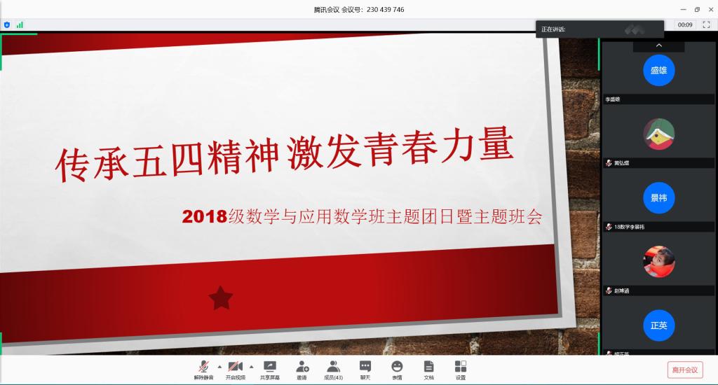 本站讯 18数学班于5月5日晚举办了题为“传承五四精神,激发青春力量”的主题团日暨主题班会。18数学班全体成员与孙磊参加了本次会议。此次会议由许鑫主持。