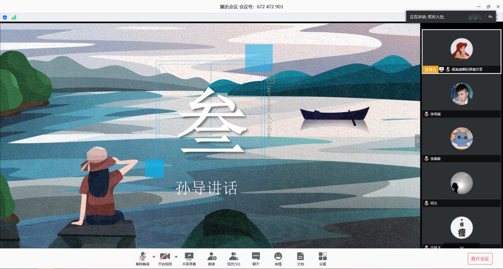 活动伊始,贾亦真用两段视频为同学们介绍了背景并拉开了主题团日活动的序幕。视频中提到,从1919年“五四运动”时青年们走上街头捍卫国家主权,到2020年面对新冠疫情新时代的青年们勇挑重担、投身“战疫”事业,五四精神一直传承至今,从未远离我们。这些青年“抗疫战士”有医护人员、外卖小哥、军人、志愿者还有学生,他们都在自己的岗位上默默贡献值自己的力量。观看完视频,贾亦真带领同学们进行了居家“战疫”情况的回顾。从同学们居家期间的打卡、防疫日志和“战疫”团课学习情况中可以看出,在居家抗疫期间同学们大都仍然保持着积极向上的生活态度。随后,贾亦真介绍了以曹新阳和秦立振为代表的参与抗疫活动的同学的事迹,并号召大家向他们学习。最后,辅导员孙磊就居家期间的一些问题进行了说明,表达了对同学们的期望,并详细回答了同学们的提问。