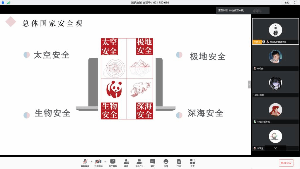 下午四点会议准时开始。贾亦真首先通过一张图片从总体国家安全观的提出、核心要义、国家安全体系和公民如何践行总体国家安全观四个方面为同学们系统介绍了总体国家安全观的相关知识。她为同学们讲解了从2013到2015年,总体国家安全观是如何一步步提出、完善并逐渐受到重视的。之后,贾亦真指出,总体国家安全观的目标是走出一条中国特色国家安全道路,总体国家安全观的核心要义包括五大要素和五对关系。接着,贾亦真强调了国家安全体系不光包含同学们比较熟悉的传统领域,还包含同学们比较陌生的非传统领域和新型安全领域,还阐释了站在公民角度该如何践行总体国家安全观。