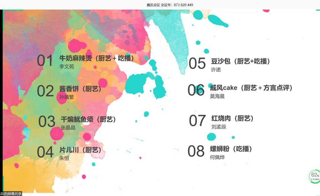 本次心理班会共有五个主题,分别为家乡介绍、才艺展示、厨艺及吃播展示、周末日常vlog以及影视作品推荐,通过前期的自行选择与分组,统计一班全体成员共分为八组依次进行展示。班会伊始,一、二组成员首先为班级同学进行家乡的介绍,通过视频、ppt等形式,带领着班级同学领略了云南、内蒙古、河北、山东、湖南、广东等不同省份的美食、风景、习俗以及风土人情。第三组为才艺展示组,小组成员通过视频的形式生动展现了自身的才艺,包括弹琵琶、钢琴、古筝、跳舞、唱歌等,获得了班级同学的一致好评。第四、五组为厨艺及吃播展示组,小组成员以视频这一形式,生动详细地再现了美食的制作及享受美食的过程。第六、七组为周末日常vlog分享组,本组成员通过视频这一形式向班级同学分享了自己丰富又有意义的周末生活,激励着班级同学积极寻找并关注生活里的小美好。最后,作为影视作品推荐组的八组,成员们通过ppt的形式向班级同学介绍并推荐了几部品质良好的影视作品。
