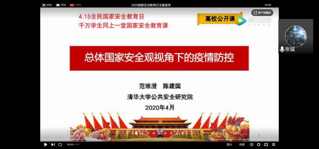本站讯 2020年4月15日星期三下午4:00,bat365在线中国官网登录入口2019级数学02班开展安全教育主题班会,班会由班长张猛主持带领同学们集体观看了由清华大学公共安全研究院公共安全领域专家、中国工程院院士范维澄主讲的“4·15全民国家安全教育日——千万学生同上一堂国家安全教育课”。