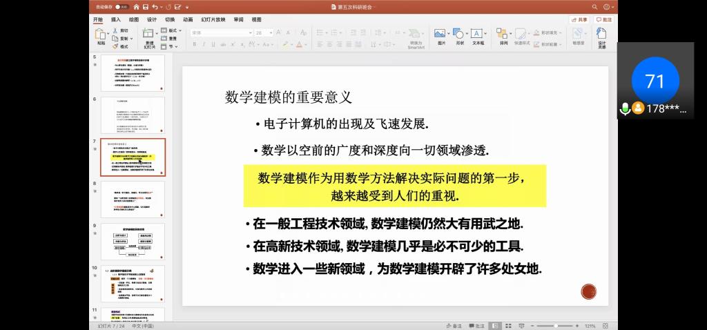 科研班主任李佳琪以“数学建模 ”为主题,开展了此次第五期科研班会。首先,班主任向同学们讲解了“什么是数学建模”,通过举出实际事例和题目以及相关题目的基本步骤和讲解,生动具体地诠释了数学建模的定义,深刻强调了数学建模的重要意义。接着,班主任对于我们可以参加的各种数学建模比赛进行了具体的介绍和经验分享,例如比赛时间、比赛要求、比赛意义、获奖比例、纪律规定、注意事项等。然后,班主任在组队方面进行了详细的讲解,并且对于队员选择、任务分配、专业分布、自我定位等方面给出了中肯的建议,真诚地向同学们分享了自己的经验,同学们从中学到了很多。最后,班主任向同学们提出了关于“现在可以做哪些准备”的建议,列举了我们需要学习的各个方面和书本论文,以及学校内的相关课程,推荐了许多与数学建模有关的编程软件、绘图软件和统计软件。针对同学们提问的问题,班主任认真回答,为同学们答疑解惑。