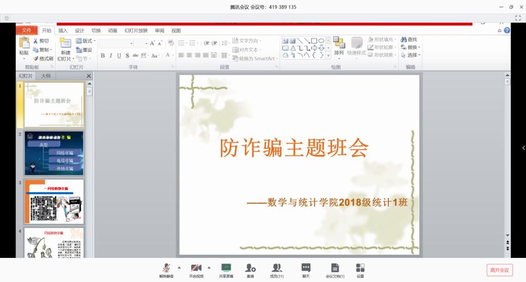 本站讯 2020年3月25日下午四点半,bat365在线中国官网登录入口(威海)bat365在线中国官网登录入口2018级统计一班于线上举办防疫期间第六次线上主题班会,本次线上班会为防诈骗主题班会,旨在提醒班级同学要警惕诈骗,注意人身财产安全。本次班会由团支书秦千主持,统计一班全体成员参加。