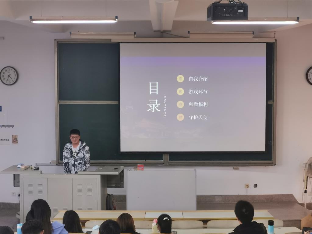 班会伊始,班长高锋请由其他学院转专业来到2019级统计学二班的新同学们进行自我介绍,让同学们相互了解,熟悉彼此。随后,班会进入游戏环节。以“国”字为主题的歌曲接龙、搭肩抓手等游戏,拉近了同学间的距离,让同学们不再拘谨。“快乐传真”中,六人一组,第一个人用肢体语言表达给定的词语,后面依次传递,让最后一位同学猜。参赛同学手忙脚乱的表演,困惑迷茫的表情令在座的同学忍俊不禁。随后又进行了“交换名字”、“就不听指挥”等游戏,让每一位同学都参与到了游戏当中。游戏环节结束后,高锋分发了他在中秋佳节之际为全体同学准备的月饼,给同学们在初秋的凉意中带来温暖。班会最后,高锋让同学们在纸条上写下自己的姓名、联系方式,通过抽签的方式确定了每个人在接下来的一周里需要守护并不能被发现的同学,可以向对方提供一声晚安,一句安慰,一顿早餐等。班会在热烈的掌声中落下了帷幕。