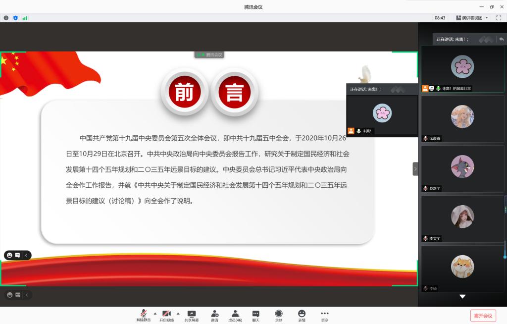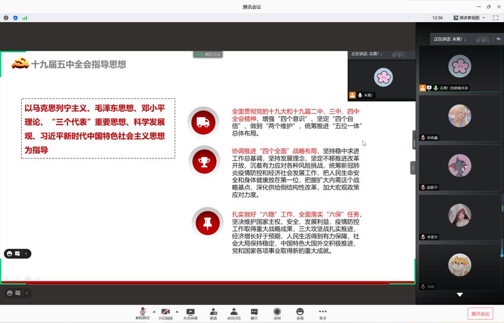 本站讯 11月23日上午10:00,2019级信息与计算科学班举办“学习党的十九届五中全会精神”主题团日活动,本次主题团日活动通过腾讯会议以线上班会的形式开展,由团支书王肖晴主持,共49名团员出席此次会议。