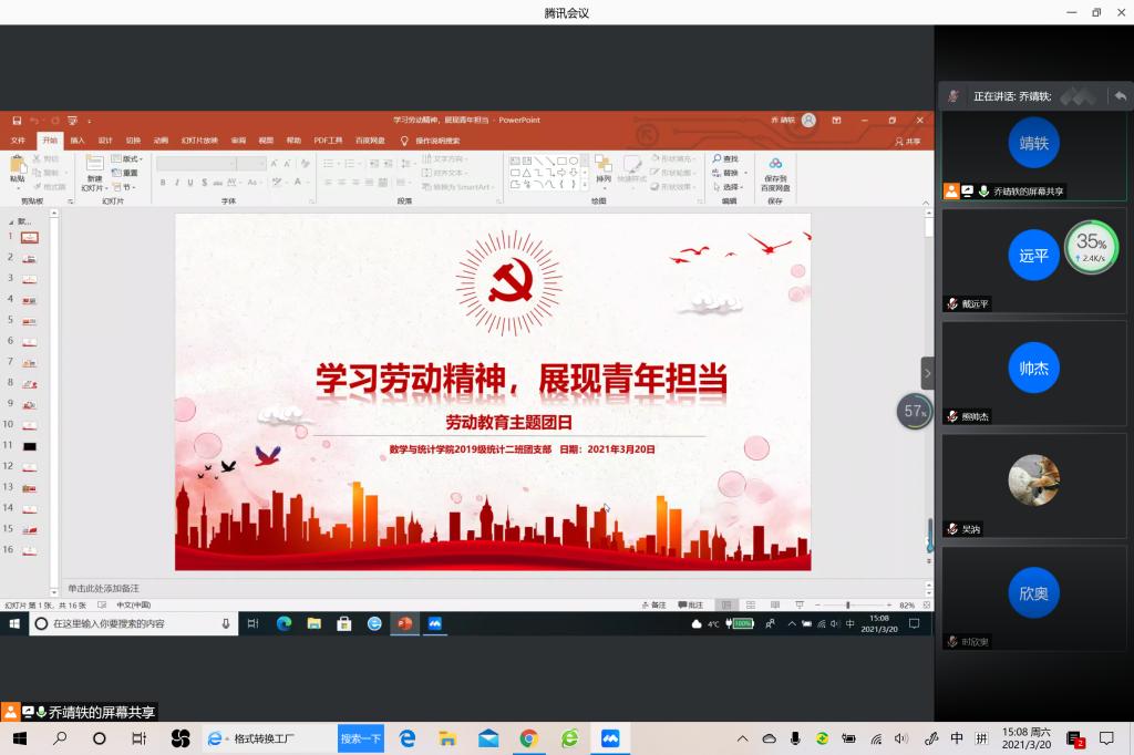 本站讯 3月20日下午15:00,bat365在线中国官网登录入口2019级统计学二班开展“学习劳动精神,展现青年担当”主题团日活动,本次主题团日活动以线上会议的形式进行。本次会议由团支书乔靖轶主持,2019级统计二班全体同学参加。