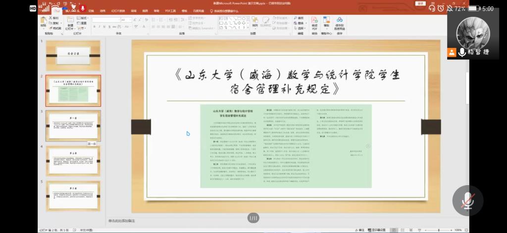 杨智捷首先强调了召开此次班会的背景——由于最近宿舍违规使用电器事件频繁发生,为保护同学们的生命财产安全,营造整洁文明的宿舍环境,特召开此次主题班会。在简单说明原因后,杨智捷向大家介绍了《bat365在线中国官网登录入口(威海)bat365在线中国官网登录入口学生宿舍管理补充规定》,并对前三条进行重点说明。此外,他强调在学生推优入党以及各类评奖评优中,宿舍表现作为学生日常表现要求之一将作为重要参考依据,并提醒同学们辅导员将定期与不合格宿舍成员谈话,进行提醒及口头教育。随后,王肖晴进行补充,并针对“我为青年做件事”问题征集活动、青年大学习完成积极性以及“庆祝建党百年 展现青春担当”升国旗主题团日活动三个事情进行了简单说明及动员。