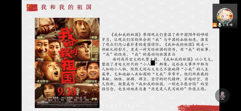 团支书王肖晴首先向大家简单介绍了十一国庆节的来历、作用及基本特征,并分成了国庆节知识问答、志愿军烈士遗骸回国、孟晚舟回国、观影《我和我的祖国》四个篇章向大家弘扬爱国主义精神。在知识问答环节中,大家踊跃回答国庆节的相关知识,充分活跃了会议气氛。祖国的强大是无数的英雄用鲜血和生命换来的。就在今年9月3日,第八批在韩志愿军烈士遗骸安葬仪式在沈阳举行,团支书带领大家用100秒回顾了第八批志愿军烈士的回家路,同学们在观看视频后,纷纷留言向烈士致敬。2021年9月25日,中国公民孟晚舟在经过三年的无理拘押后乘坐中国政府包机返回祖国。经过团支书王肖晴的简单介绍后,同学们的爱国之情被激起,并纷纷表示自己切实感受到了国家的强大以及国际地位的提升。活动最后,大家一起观看了影片《我和我的祖国》,一起回顾了祖国的成长历程。