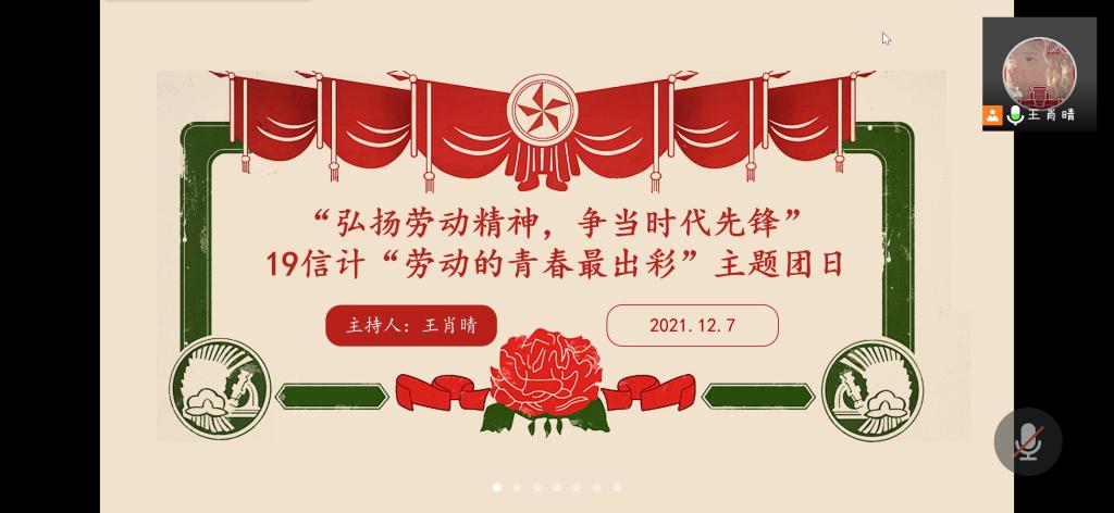 本站讯 2021年12月7日下午17:00,2019级信息与计算科学团支部举办“弘扬劳动精神,争当时代先锋”——“劳动的青春最出彩”主题团日活动。活动由2019级信息与计算科学团支部书记王肖晴主持,团支部共52名同学参加。