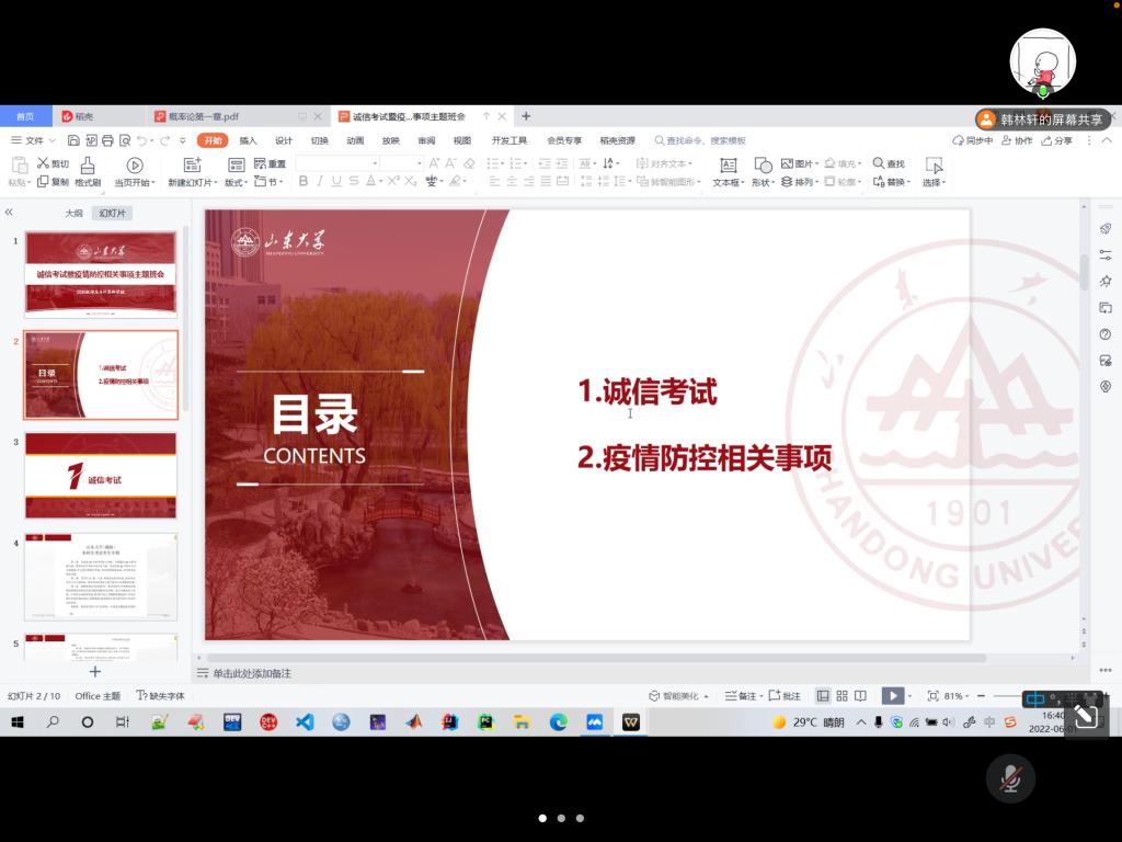 至此,2020级信息与计算科学班诚信考试暨疫情防控相关事项主题班会顺利结束。本次主题班会的开展,让同学们明白了诚信考试的重要性,带领同学们回顾考试流程安排,同时贯彻学校疫情防控相关要求,落实了加强疫情防控的相关任务,提高了同学疫情防控意识,为保障同学们的健康校园生活打下了基础。