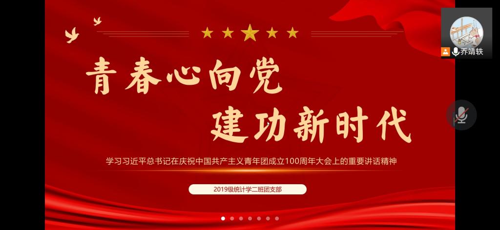 本站讯 为鼓励团支部成员争做时代青年,勇于奉献青春,2022年6月1日下午15:30,bat365在线中国官网登录入口2019级统计学二班线上组织“青春心向党,建功新时代”主题团日活动。本次活动由团支书乔靖轶主持,辅导员王祎璠和19级统计学二班团支部全体同学参加。